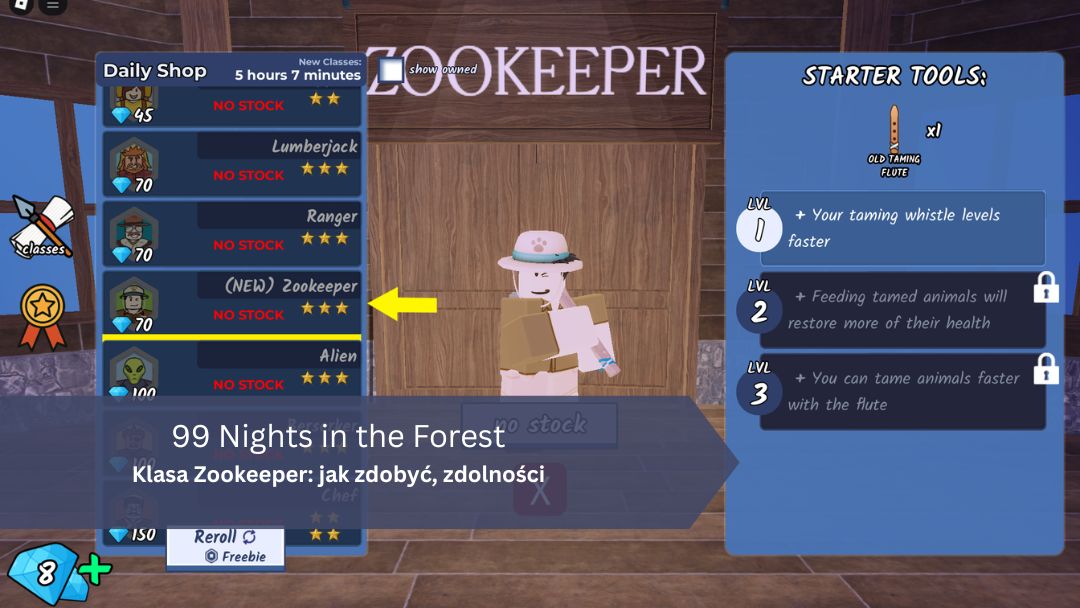 Klasa Zookeeper to ciekawa propozycja dla graczy skupionych na oswajaniu zwierząt, ale w praktyce jej potencjał jest ograniczony. Starannie przemyśl inwestycję w diamenty i sprawdź, czy bonusy związane z fletkiem i karmieniem zwierząt rzeczywiście pasują do Twojego stylu gry. Dla większości graczy bardziej opłacalne może okazać się rozwijanie innych klas, które oferują większą przewagę w walce i przetrwaniu w 99 Nights in the Forest.