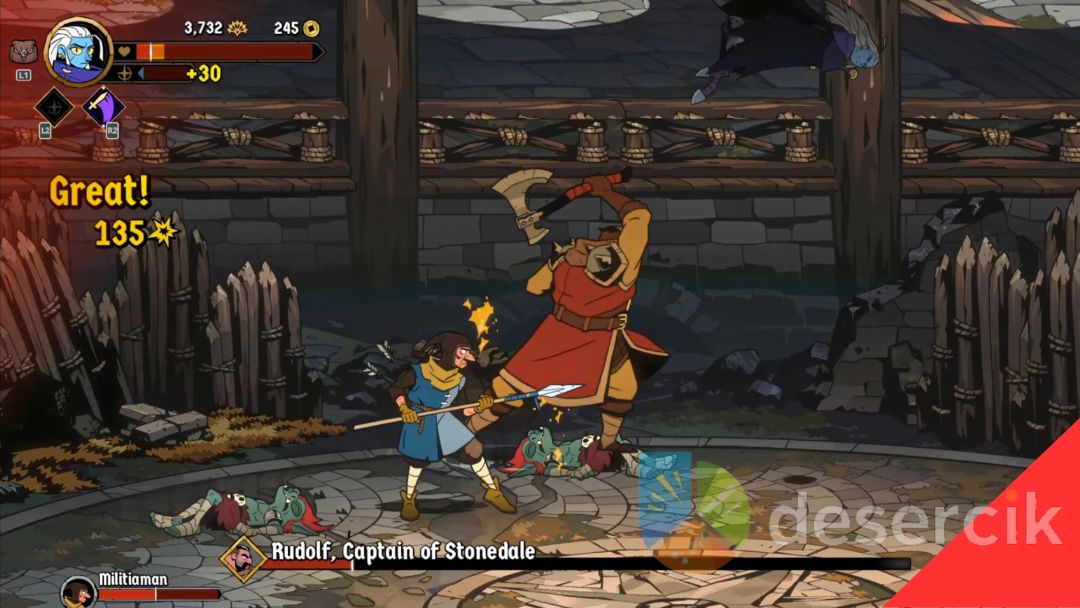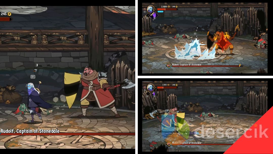 W świecie Absolum, jednym z pierwszych bossów, z którym przyjdzie ci się zmierzyć, jest Rudolf, Captain of Stonedale. W przeciwieństwie do Gazorga, Rudolf jest bardziej defensywny i używa tarczy, co na początku może wydawać się frustrujące, zwłaszcza gdy próbujesz zadawać mu obrażenia. Jednak po kilku próbach jego schemat ataków stanie się przewidywalny, a on sam – choć wciąż niebezpieczny – stanie się w zasadzie przystankiem, który pozwala ci zwiększyć swoją siłę przed kolejnymi wyzwaniami.