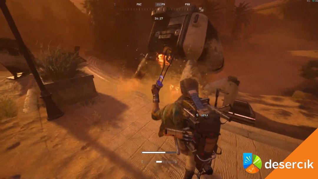 Gdy znajdziesz Bombardiera, najlepiej poczekaj, aż jego tył będzie odwrócony od ciebie, i rzuć wszystkie trzy Pioniery w jego żółty pojemnik – to najsłabszy punkt. Jeśli Bombardier nie zostanie zniszczony, użyj Anvila, celując w żółte stawy nóg, które biorą najwięcej obrażeń. Po zniszczeniu rzuć Granaty dymne i zbieraj jego części.