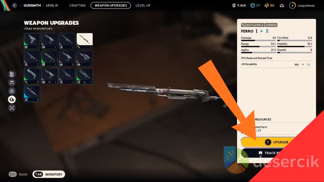 Po wybraniu broni zwróć uwagę na panel po prawej stronie ekranu i kliknij Ulepsz. To podniesie broń z poziomu 0 do 1, później z 1 do 2 i tak dalej. Za każdym razem potrzebujesz określonych materiałów, które są wskazane pod przyciskiem ulepszenia.
