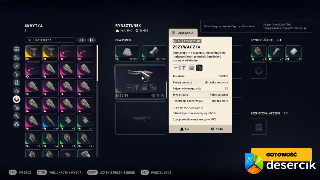 Bettina jest bronią o dużym „pancernym” kopa, ale wymaga cierpliwości. To sprzęt dla graczy, którzy wolą celować i wykańczać jednostki punktowo, zamiast sypać salwami. Możesz traktować ją jak pół-snajperkę – idealna na średnie dystanse, kiedy wiesz, że musisz wykończyć konkretny dron zanim podejdzie za blisko.