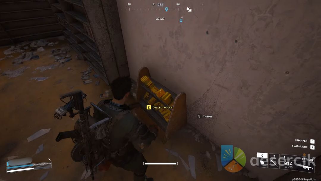 Biblioteka znajduje się na północnej części mapy Pogrzebane Miasto, niedaleko ruin targowiska. Po dotarciu do budynku wejdź do środka i skieruj się prosto w stronę regałów po prawej stronie, gdzie czeka pierwsza książka. Aby ją zebrać, podejdź do odpowiedniego miejsca i naciśnij przycisk interakcji (E).