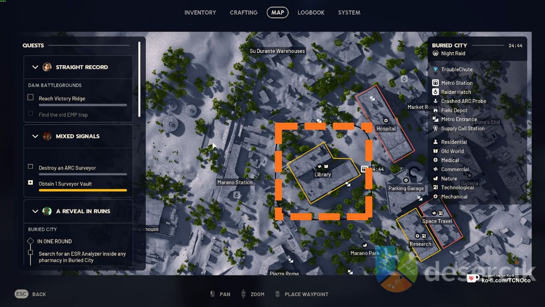 Zanim wejdziesz do samej biblioteki, warto dobrze przygotować się do misji. Przede wszystkim sprawdź, czy masz w ekwipunku Looting Mk. 2, który pozwoli ci bezpiecznie przechowywać książki w Bezpiecznej Kieszeni. To istotne, bo w trakcie eksploracji biblioteki mogą pojawić się patrole ARC, a śmierć bez zabezpieczenia książek oznaczałaby konieczność zaczynania od nowa.