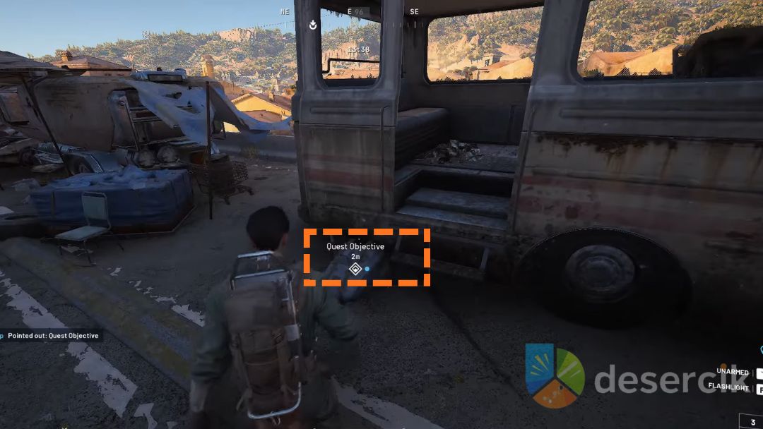 Gdy podejdziesz bliżej rozbitego autobusu, powinieneś zauważyć niebieski plecak. Wyróżnia się na tle gruzów, więc trudno go przegapić. Oznacz go i zamkniesz drugi etap zadania. To właśnie w tej chwili robi się ciekawie – bo tu zaczyna się ścieżka, którą musisz podążyć.