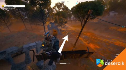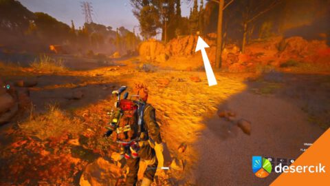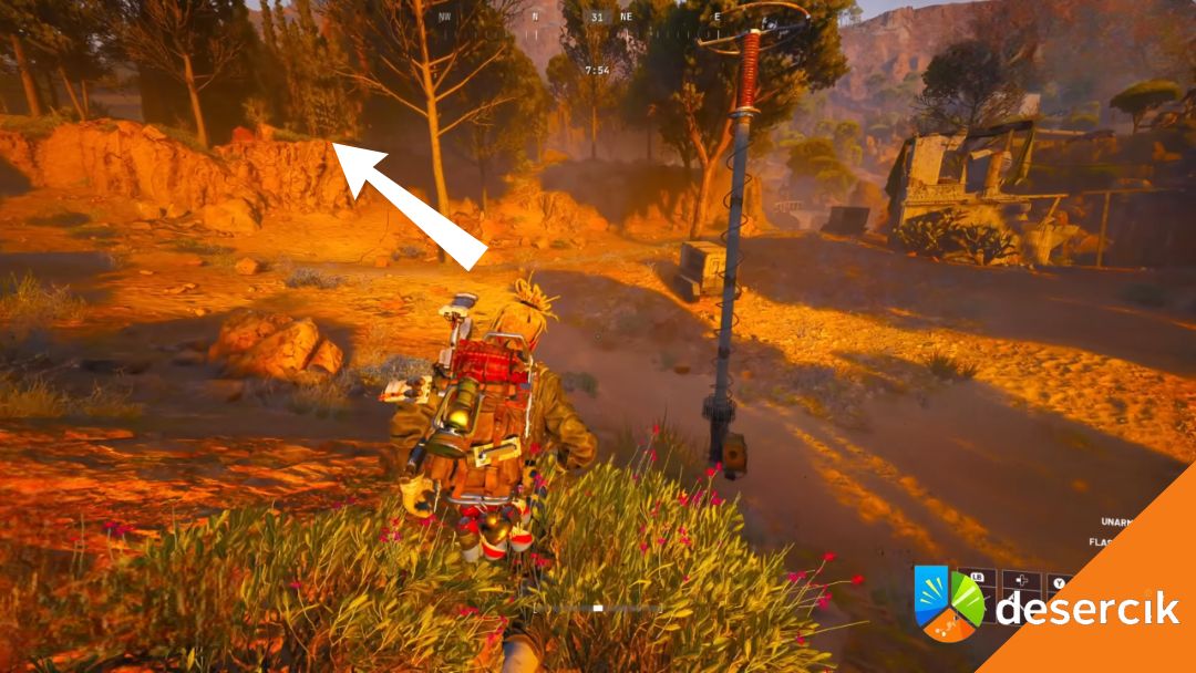 Zwróć się na północ. W oddali zauważysz niewielką skałkę, na którą da się wejść. Właśnie tam siedzi pierwszy przełącznik – jego jasny element widać nawet od pułapki. Wystarczy wdrapać się na górę i masz go w kieszeni.