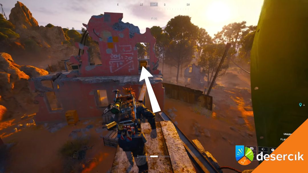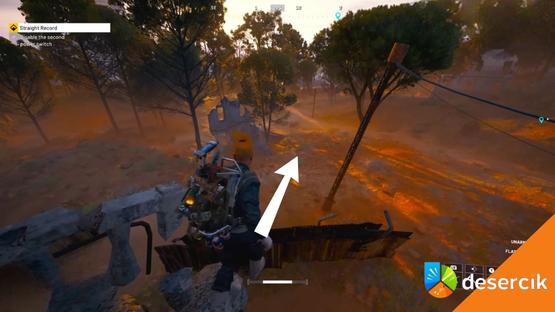 Teraz spójrz na wschód-południowy wschód. Zobaczysz grupę zrujnowanych budynków. Interesujący cię przełącznik znajduje się na czerwonym budynku, na samej górze. Najwygodniej dostać się tam korzystając z generatora stojącego po lewej stronie białej konstrukcji obok.