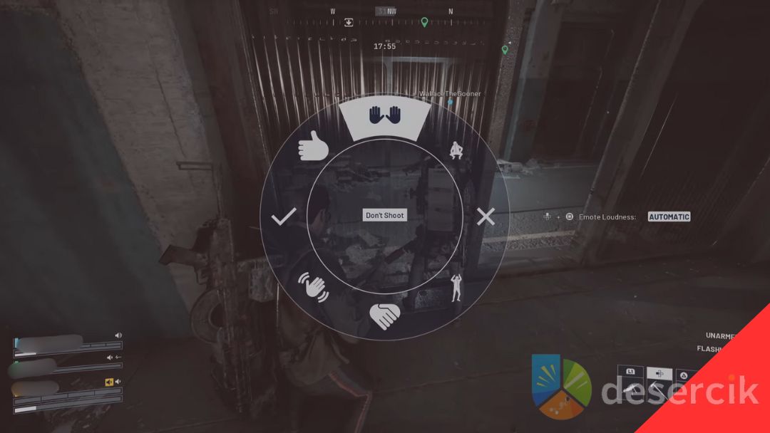 Wybierz „Don’t Shoot” – Przesuwając myszką lub prawym analogiem, podświetl opcję „Don’t Shoot”. Przytrzymaj wejście, aż zaznaczenie zostanie aktywowane. Możesz też ćwiczyć szybsze wybieranie, by reagować natychmiast, gdy spotkasz innych graczy.