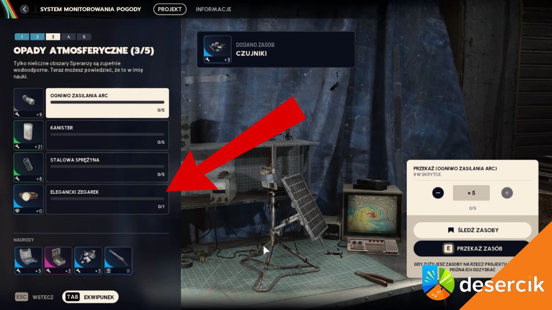 W projekcie System monitorowania pogody potrzebujesz jednak jednego Eleganckiego Zegarka, aby ukończyć trzeci etap projektu, obok Ogniwo zasilania ARC, Kanistry i Stalowe Sprężyny, które pewnie masz już w ekwipunku.