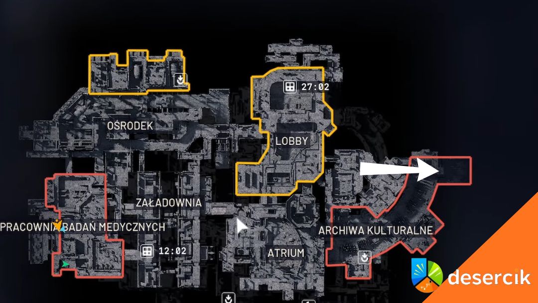 Po przejściu przez wentyl skręć w prawo i podążaj korytarzem, aż dojdziesz do tablicy z napisem Archiwa Kulturalne. Na końcu korytarza czekają schody i tyrolka, które prowadzą bezpośrednio do archiwum. Zejdź na drugie piętro, a tam będzie wejście do archiwów kulturowych.
