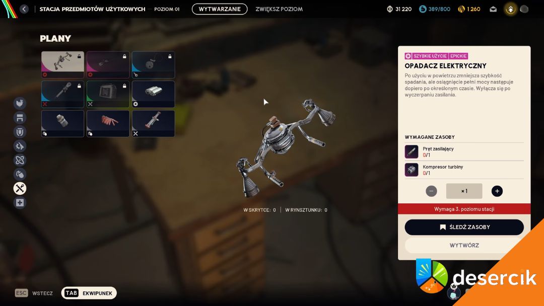 Aby móc go stworzyć, trzeba wcześniej ulepszyć Stację przedmiotów użytkowych (Utility Station) do poziomu 3, ponieważ dopiero wtedy odblokowuje się możliwość craftingu w bazie w Speranza.