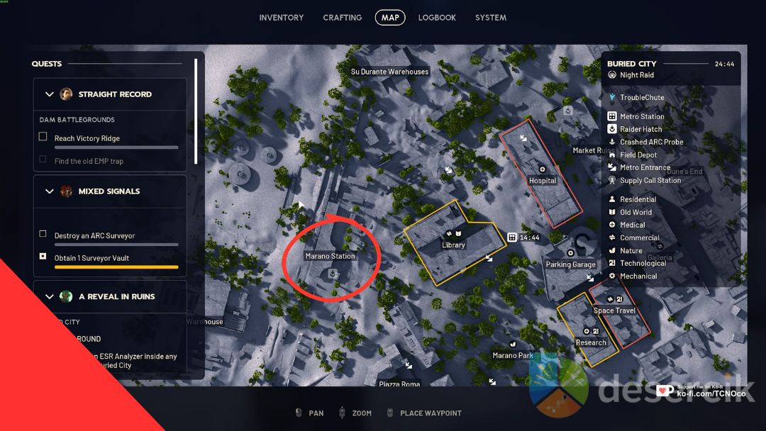 W pewnym momencie łańcucha zadań od Tian Wena trafisz na misję Korekta Rynkowa. Gra mówi tylko, żeby w Pogrzebanym Mieście namierzyć i sabotować jakąś skrytkę. W praktyce sama czynność jest banalna, ale dotarcie do właściwego miejsca potrafi wyprowadzić z równowagi, szczególnie gdy dookoła latają ARC-i, a inni gracze wpadli tu dokładnie po to samo.