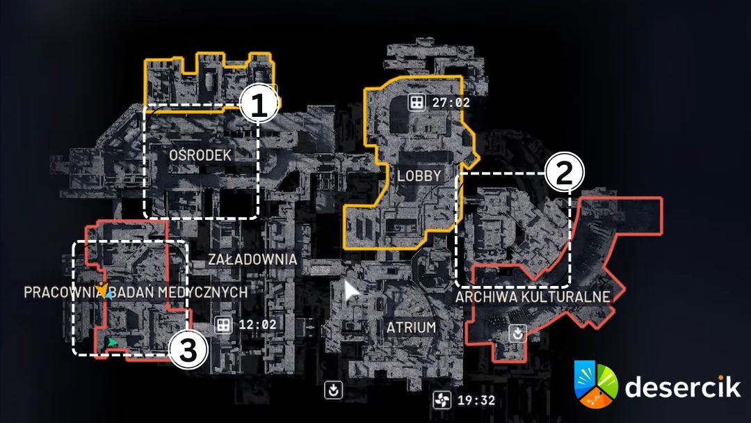 - Pracownia Badań Medycznych (3) – południowy zachód, gęsto rozstawione kontenery, pojemniki i przedmioty leżące luzem. Idealne miejsce do farmienia epickich materiałów.