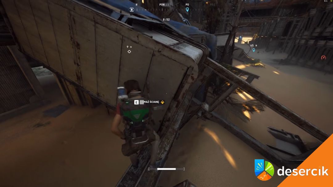 Teraz czas wejść do Składu Pojemników. Przed sobą zobaczysz budynek z tyrolką prowadzącą na dach. Wjeżdżasz nią na samą górę.