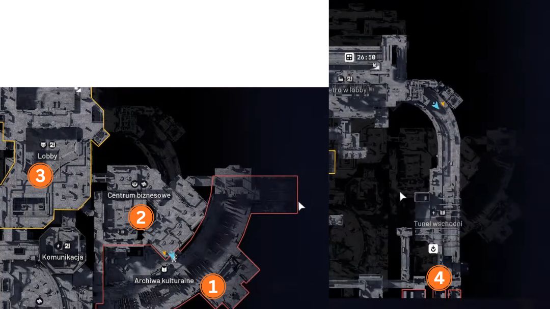 Najwygodniejsze miejsce do zebrania prawie kompletu to Archiwa kulturalne (1) oraz Bank Nasion. Obie lokacje leżą mniej więcej w tej samej linii, więc wystarczy ruszyć ze startowego Lobby na wschód. Po drodze przejdziesz przez Centrum Biznesowe (3) i Lobby (2) – bez tego nie da się dotrzeć do archiwów.