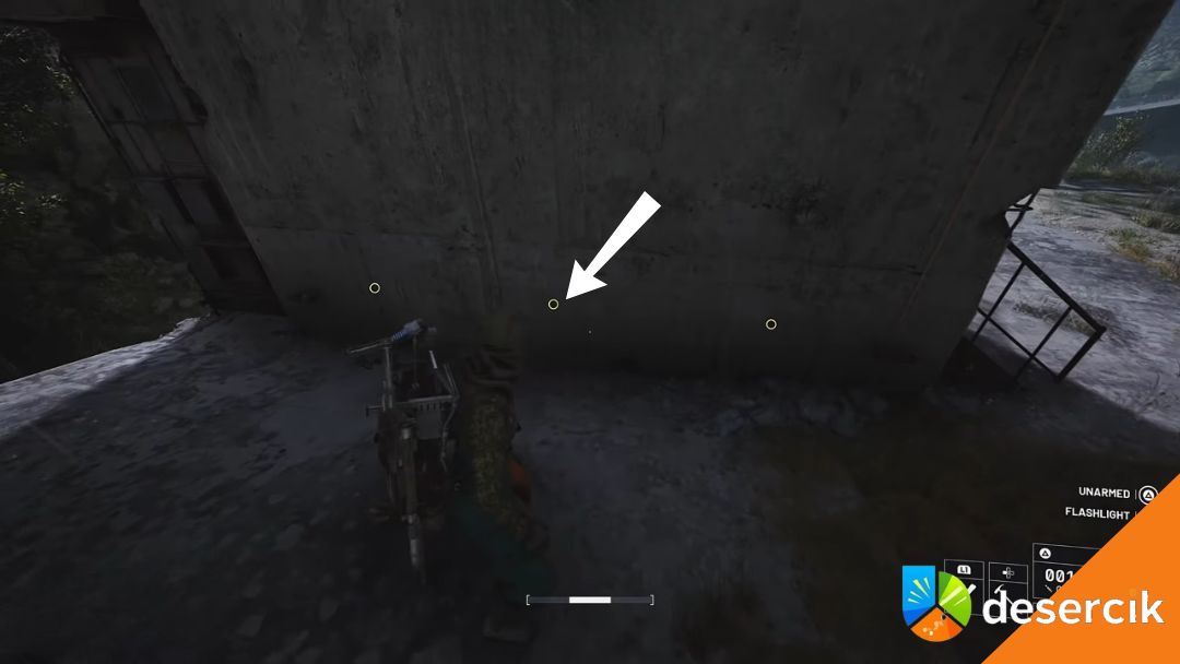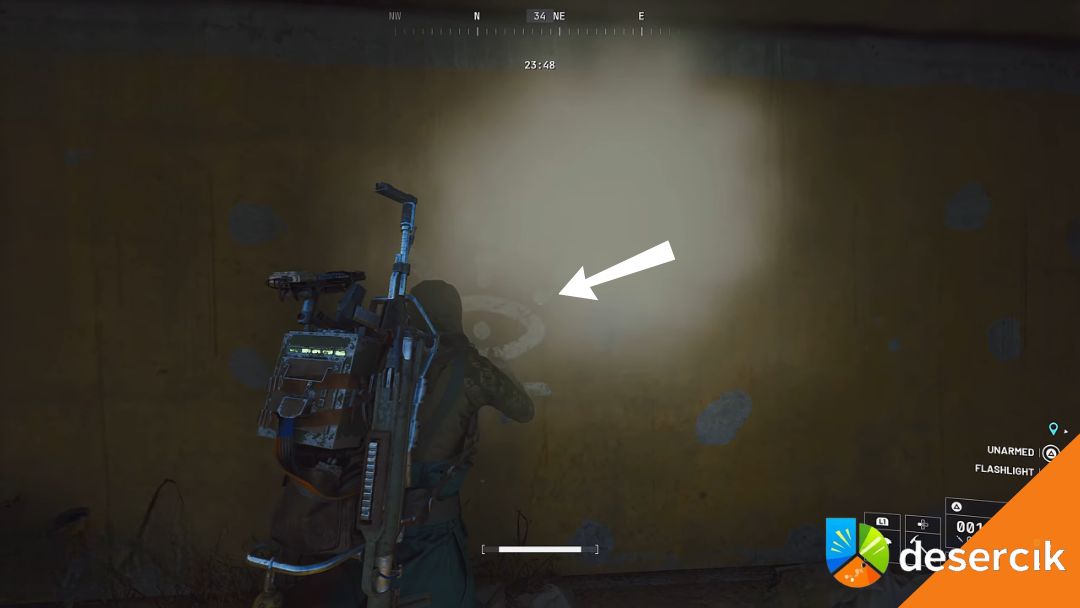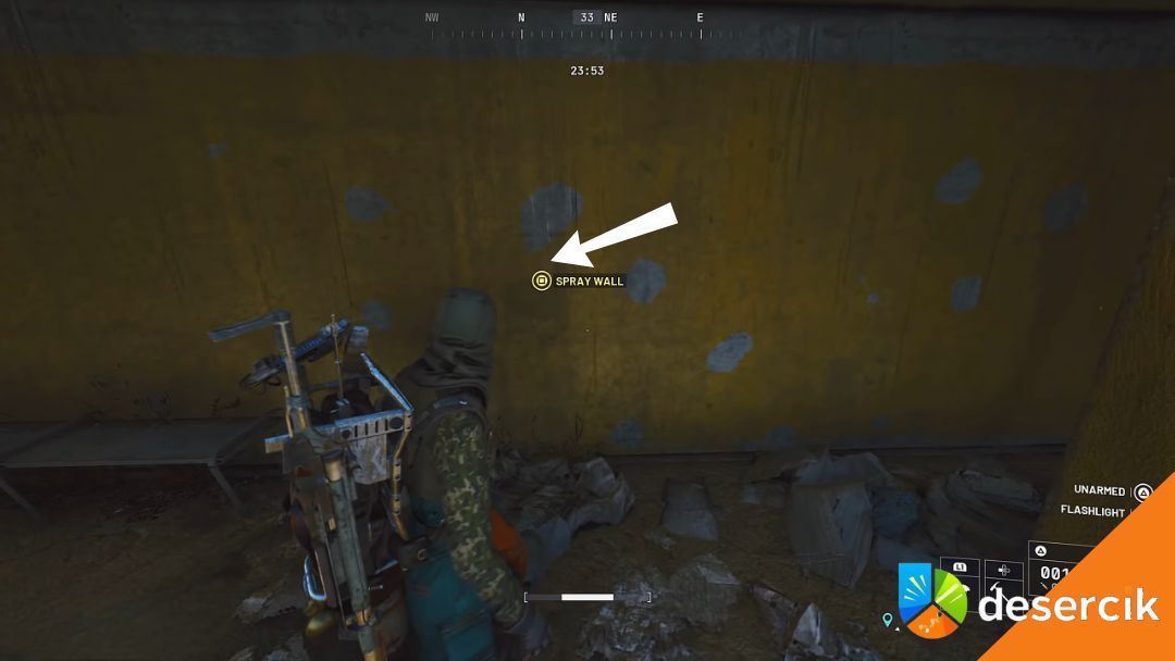 Pierwsza lokalizacja znajduje się na północy mapy. Chodzi o Wzorzysty Dom, czyli budynek, który wyróżnia się rozmiarem i charakterystyczną konstrukcją. Gdy już się tam dostaniesz, zejdź na poziom gruntu i obejdź zewnętrzne ściany. W pewnym momencie zobaczysz żółtą ikonę interakcji, to właśnie miejsce, w którym możesz zostawić swoje graffiti.