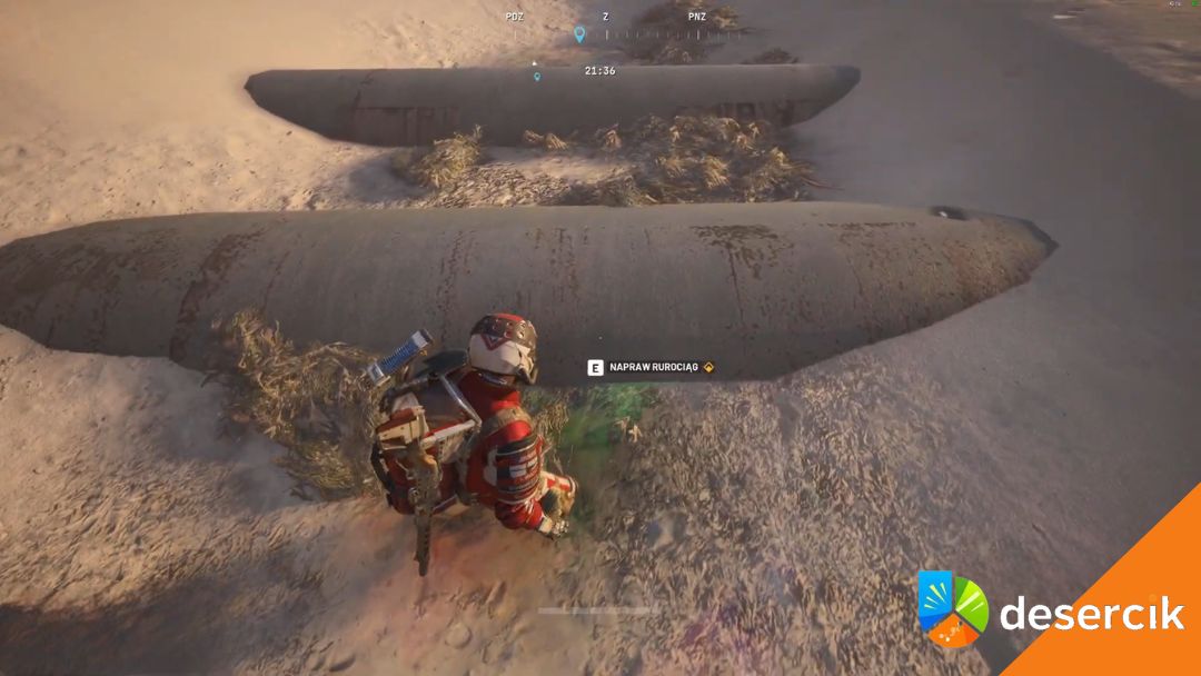 Udaj się do najbardziej południowego punktu tych rur, tam gdzie niemal stykają się z falochronem, a będziesz mógł naprawić jedną z nich obok wody z charakterystycznym, kolorowym efektem wycieku ropy.