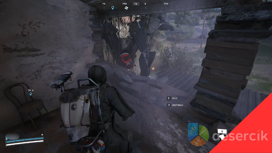 Najważniejsze: celuj w oko lub stawy nóg – to jego słabe punkty. Strzały w nogi mogą zachwiać dronem i przerwać jego skok. Nie zatrzymuj się, korzystaj z zabudowań, skał i drzew, by zablokować jego linię skoku. Unikaj otwartych przestrzeni – tam Skoczek ma przewagę.
