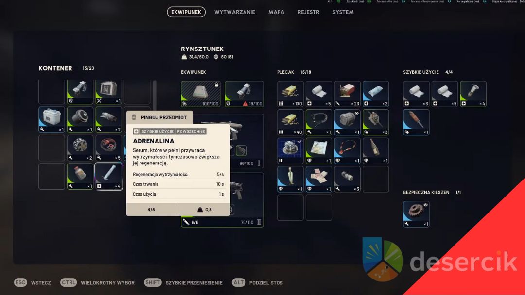 Adrenalina pozwala natychmiast odzyskać całą staminę i przez kilka sekund mieć ją praktycznie nieskończoną – warto mieć go zawsze przy sobie.