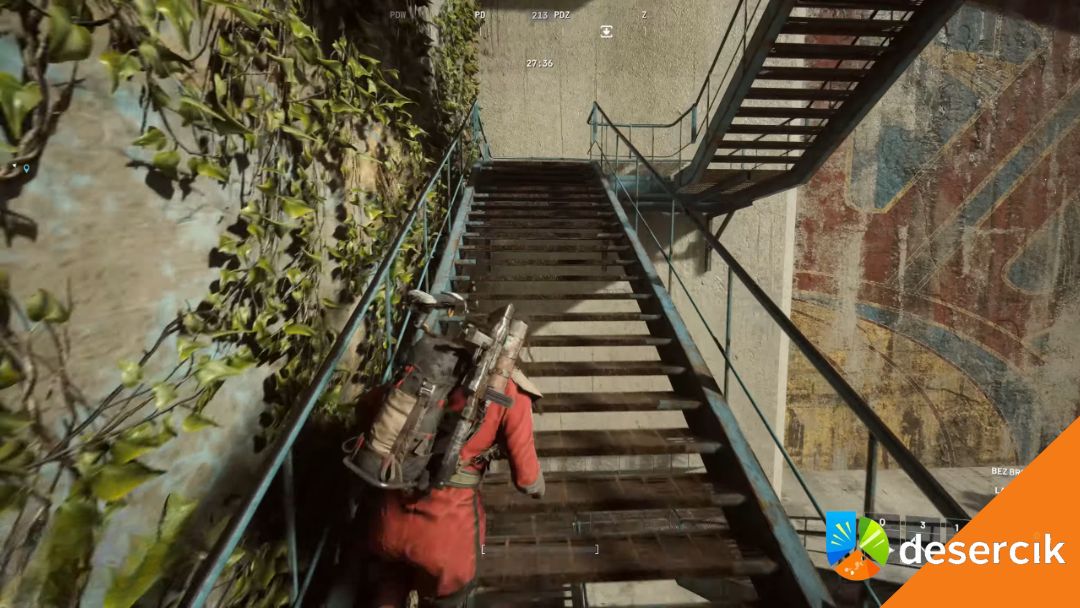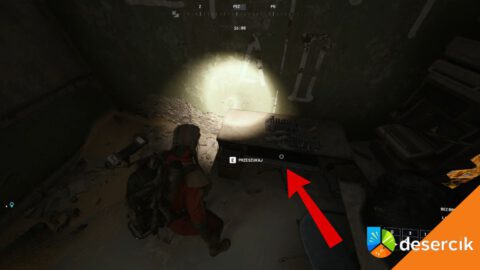 Wejdź do środka głównym wejściem, gdzie zobaczysz dwupoziomowe, uszkodzone schody. Wejdź na pierwsze piętro, po czym odwróć się i idź prosto korytarzem, następnie skręć w prawo.