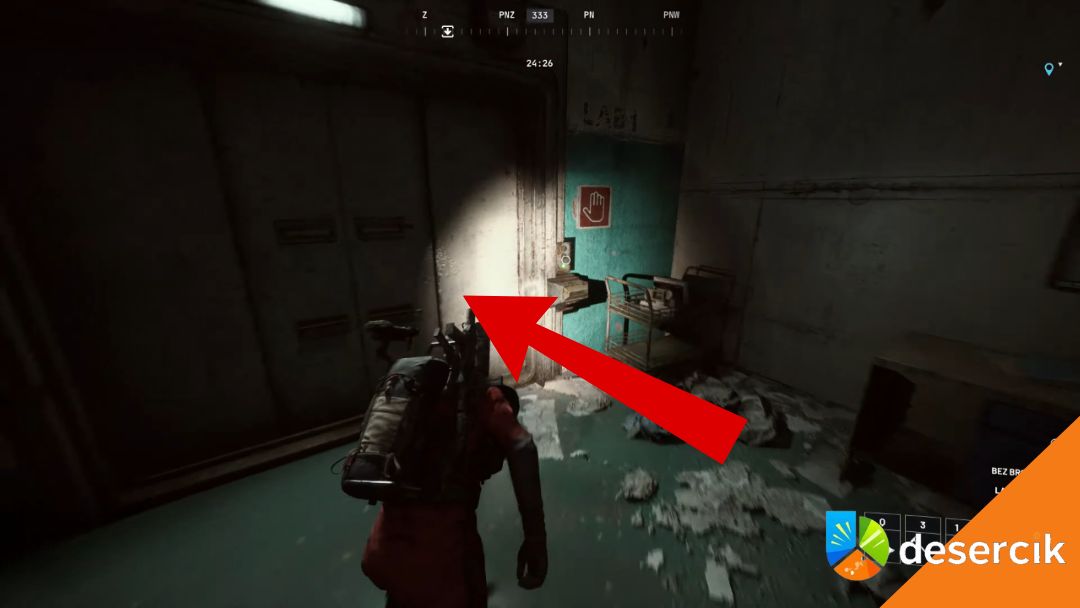 W ciemniejszej części korytarza, pod zadaszeniem, zobaczysz otwarty pokój – wejdź do niego, a potem w kolejne drzwi po lewej stronie. To właśnie sala badań, której szukasz.