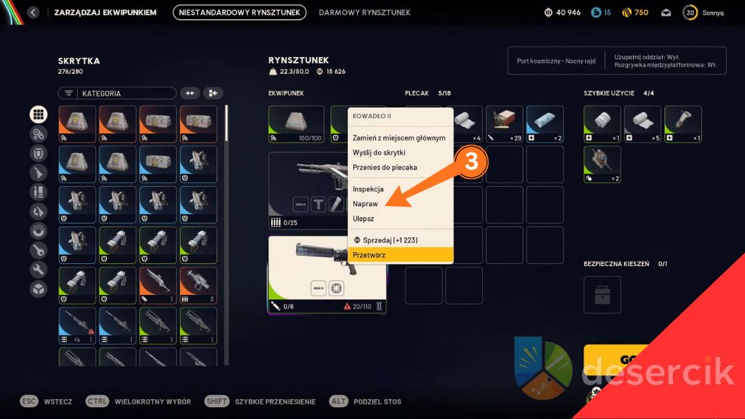 Po wybraniu wskazanej opcji otrzymujemy kolejne okno dialogowe, na którym widzimy jakich materiałów (4) potrzebujemy do naprawy. Jeśli nie masz żadnego z tych materiałów to skorzystaj z opcji śledzenia (7) w grze podczas rajdu, dzięki temu będziesz wiedział, że zdobyty sprzęt czy materiał potrzebny Ci jest do ulepszeń czy właśnie naprawy.