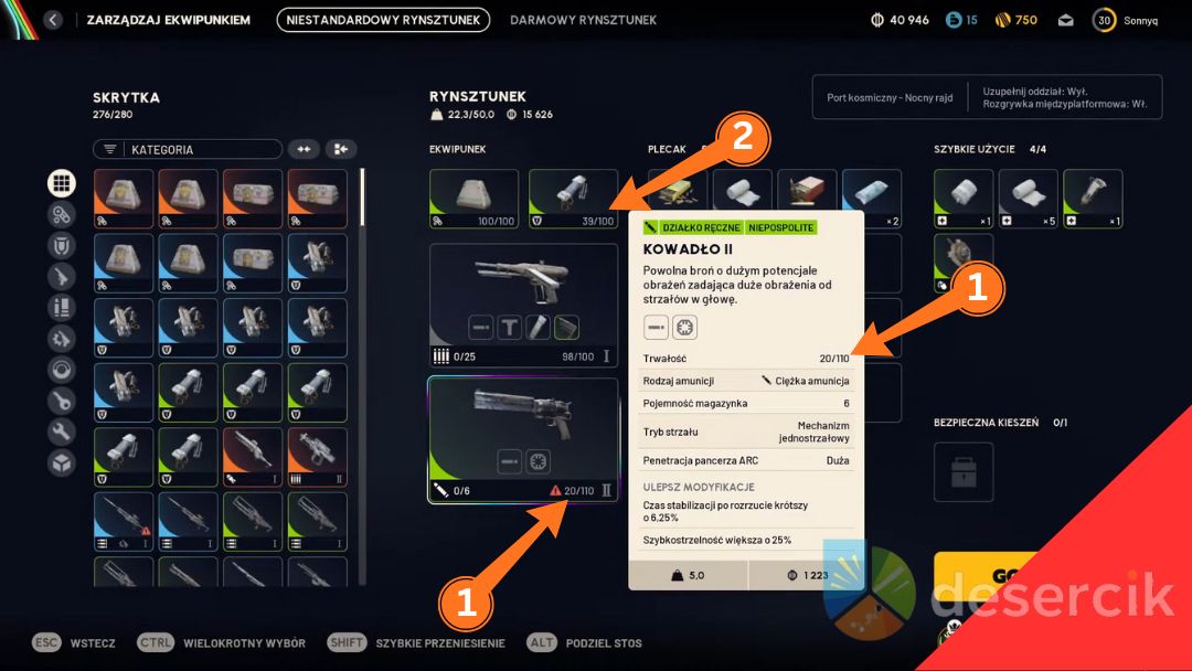 Patrząc na Rynsztunek spójrz na liczby (2) pod ich ikonami. Jest to wskaźnik trwałości, który wyświetlany jest również po kliknięciu na dany element ekwipunku (1). Oprócz samych liczb, gdy trwałość spadnie poniżej określonego poziomu, zobaczysz również ostrzeżenie w postaci ikonki (1 na dole). Jeśli trwałość spadnie do zera to stracisz broń czy osłonę, a to w trakcie samego rajdu może być końcem Twojej podróży.