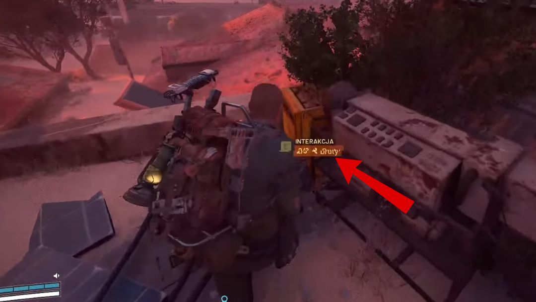 Na zachodnim krańcu tarasu zobaczysz żółty panel z ikoną interakcji. Jeśli masz przy sobie trzy druty, możesz od razu włączyć interakcję i zakończyć zadanie.