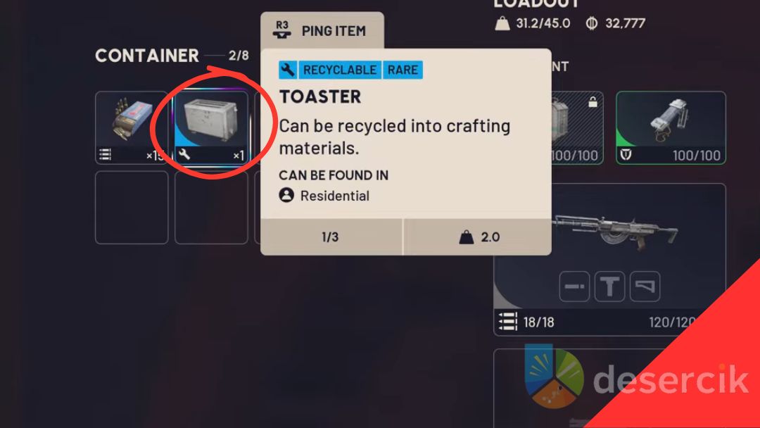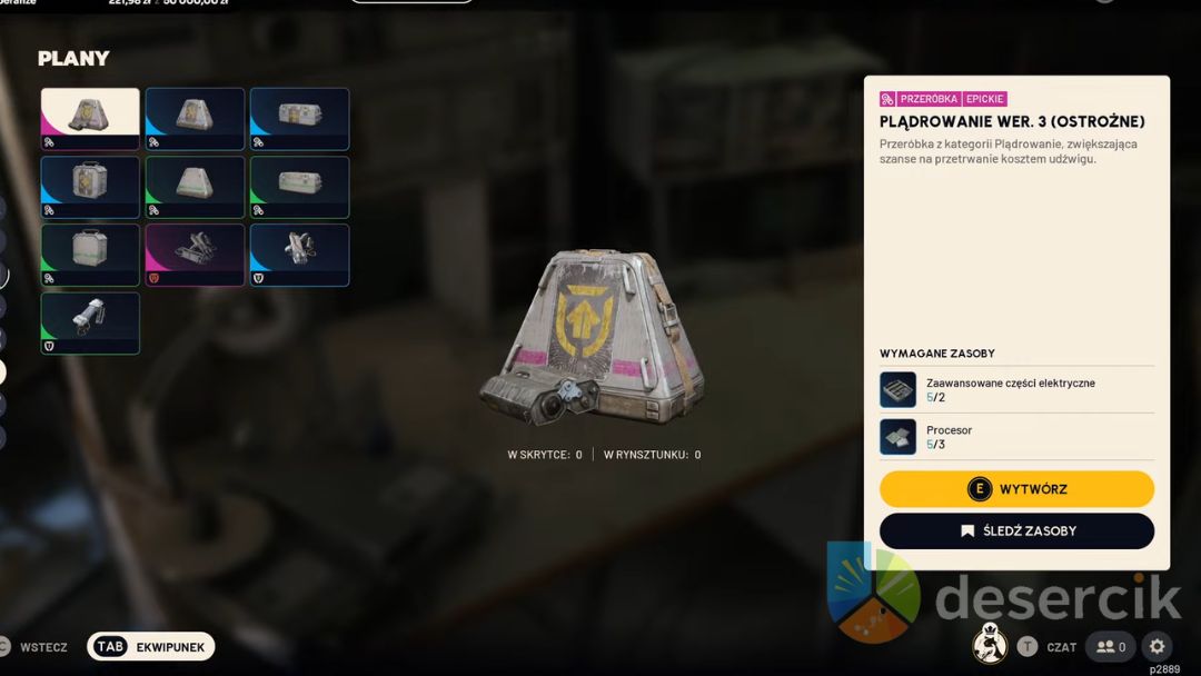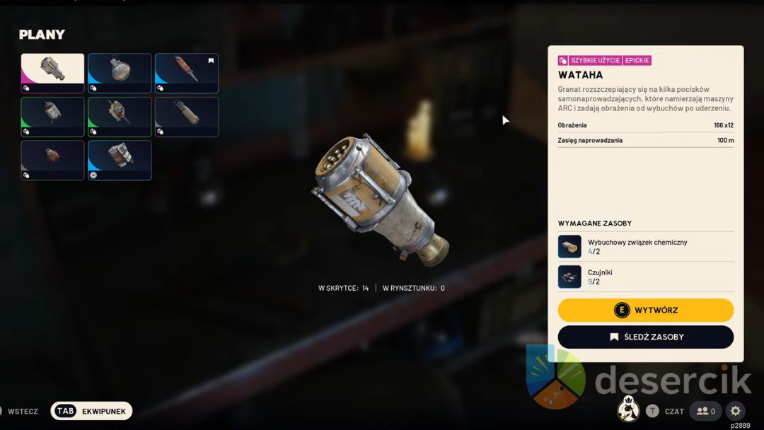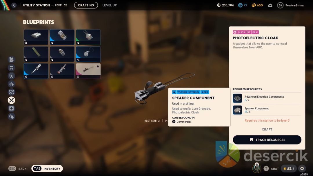 Tutaj robi się najciekawiej, bo właśnie przy stanowisku użytkowym tworzysz rzeczy, które wpływają na przebieg całych rajdów: klucze do skrytek, wabiki, granaty narzędziowe i przede wszystkim Peleryna Fotoelektryczna. To jeden z przedmiotów, który potrafi uratować Cię z opresji, gdy nagle znajdujesz się w środku zgrai ARC-ów.