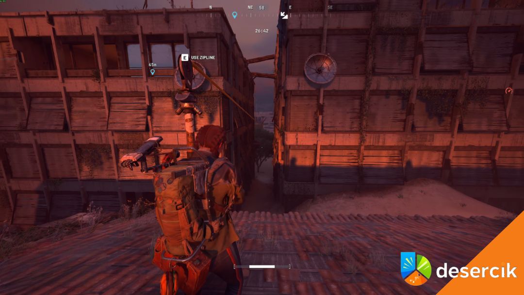 Gdy dotrzesz na miejsce, zwróć uwagę na tyrolkę (zipline) rozciągniętą między dwoma budynkami. To właśnie nią dostaniesz się do odpowiedniego mieszkania.