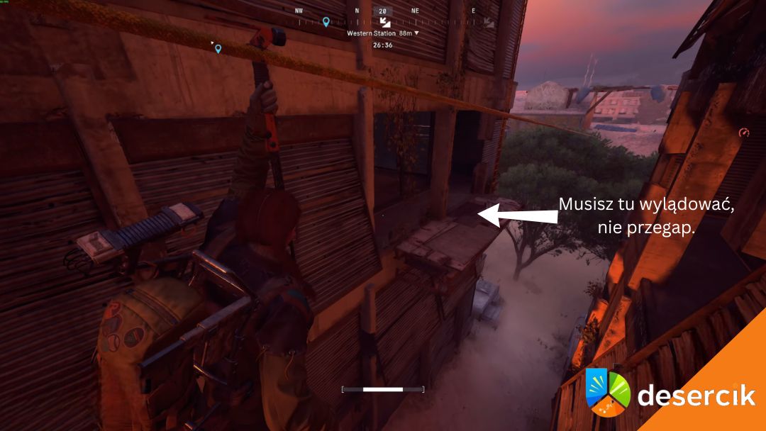 W trakcie przejazdu tyrolką musisz wypatrzyć metalową platformę prowadzącą do apartamentu. W odpowiednim momencie zeskakujesz z liny i lądujesz na platformie. Jeśli przegapisz moment, będziesz musiał wrócić i spróbować ponownie.