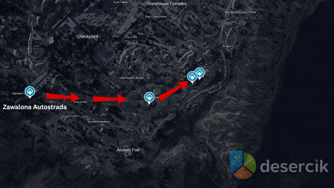 Dokładna lokalizacja zdjęcia autostrady znajduje się tuż nad napisem „Zawalona Autostrada” na mapie. Wśród drzew i przewróconych samochodów pojawi się prompt „zrób zdjęcie”, który natychmiast zaliczy ten cel.