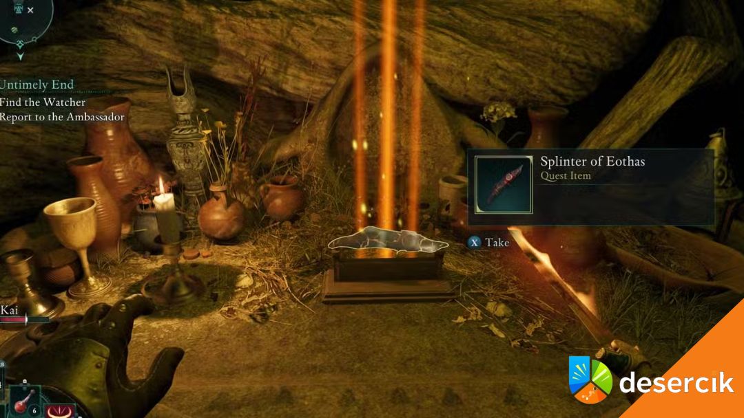 Najpierw wejdź w przejście za Oraklem i podążaj systemem jaskiń aż do dużej otwartej przestrzeni z wrogami-pająkami. Po oczyszczeniu terenu użyj skał, aby przeskoczyć przez zniszczone schody po prawej i wejść do świątyni. Tam znajdziesz Odłamek Eothasa, po czym pojawi się armia nieumarłych i ich boss.