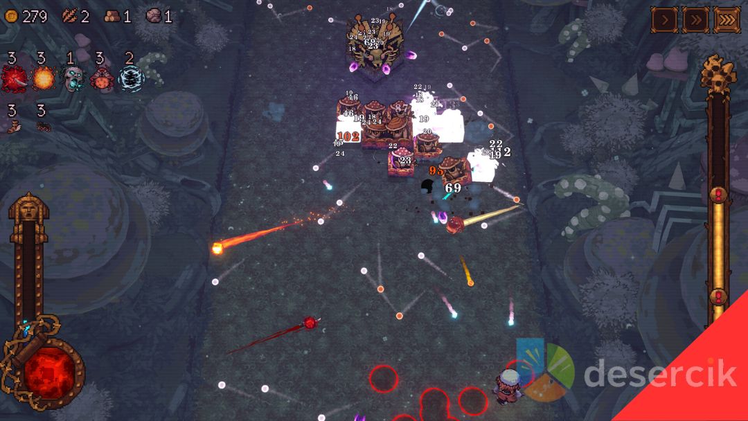 Mechanika jest jednocześnie prosta i wciągająca. Sterujemy bohaterem lewym drążkiem, a strumień kul kierujemy prawym. Przeciwnicy mogą nas uszkodzić, jeśli dotrą do dolnej krawędzi ekranu lub trafią pociskami. Ruch jest kluczowy, nie tylko by unikać ataków, ale także by zbierać XP i przedmioty, które zostawiają wrogowie. Po każdym poziomie wybieramy nowe kule lub pasywne umiejętności, co nadaje każdemu runowi świeżości.