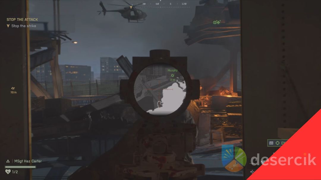 Po chwili docieracie do opuszczonego magazynu, skąd słychać głosy wroga. Twoja ekipa zjeżdża na linach i zaczyna walkę w dymie – warto wtedy wykorzystać termowizję, żeby szybko eliminować przeciwników.