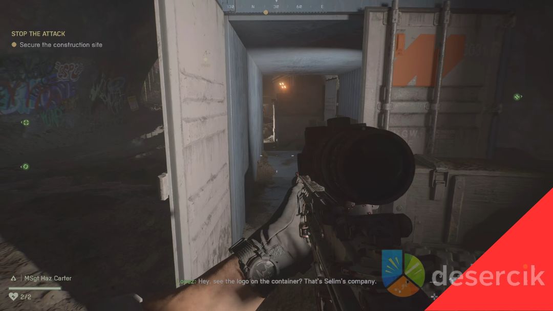 Zanim ruszysz dalej, zerknij w prawo – w oświetlonym kontenerze znajdziesz trzeci nieśmiertelnik Omar Ashraf. To ostatni przedmiot kolekcjonerski z tej misji, więc przy okazji zaliczasz kampanijne wyzwanie i zdobywasz Gridlock NATO Character Skin.
