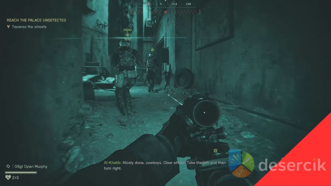 Dron Al-Khatiba pokieruje was w wąskie alejki, gdzie słychać krzyki i strzały z oddali. W pewnym momencie natrafisz na samotnego żołnierza patrolującego ulice – wtedy automatycznie wyciągasz nóż. Podejdź od tyłu i zlikwiduj go po cichu.