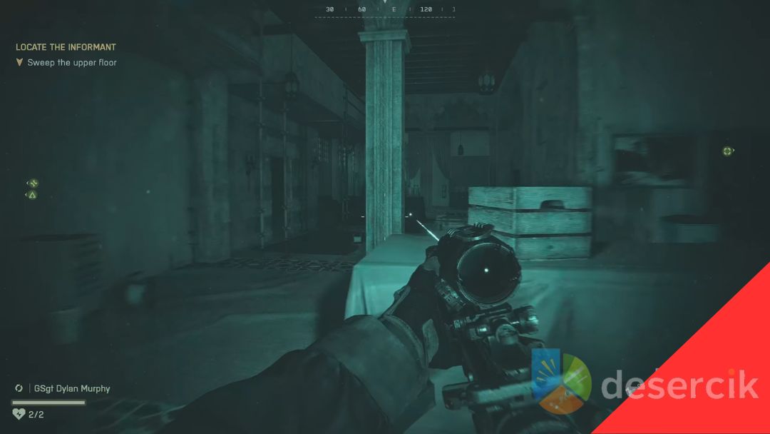 Kiedy oczyścisz teren, rusz z drużyną na drugie piętro. W korytarzach szaleje ogień, dym utrudnia widoczność, więc wyłącz noktowizor, jeśli tylko przeszkadza. Na końcu znajdziesz pokój z komputerem i pierwszym kolekcjonerskim nieśmiertelnikiem (Ahmed Gamal) – wisi za zasłoną w łazience.