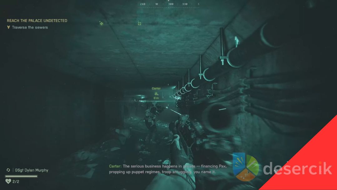 Podążaj za oddziałem do włazu prowadzącego do kanałów. Tam aktywujesz noktowizor i otwierasz kratę. Ruszcie powoli w głąb tuneli, nasłuchując rozmów żołnierzy Pax nad wami. Po chwili Carter otworzy drugą bramę, a w końcu dotrzecie do drabiny prowadzącej na powierzchnię.