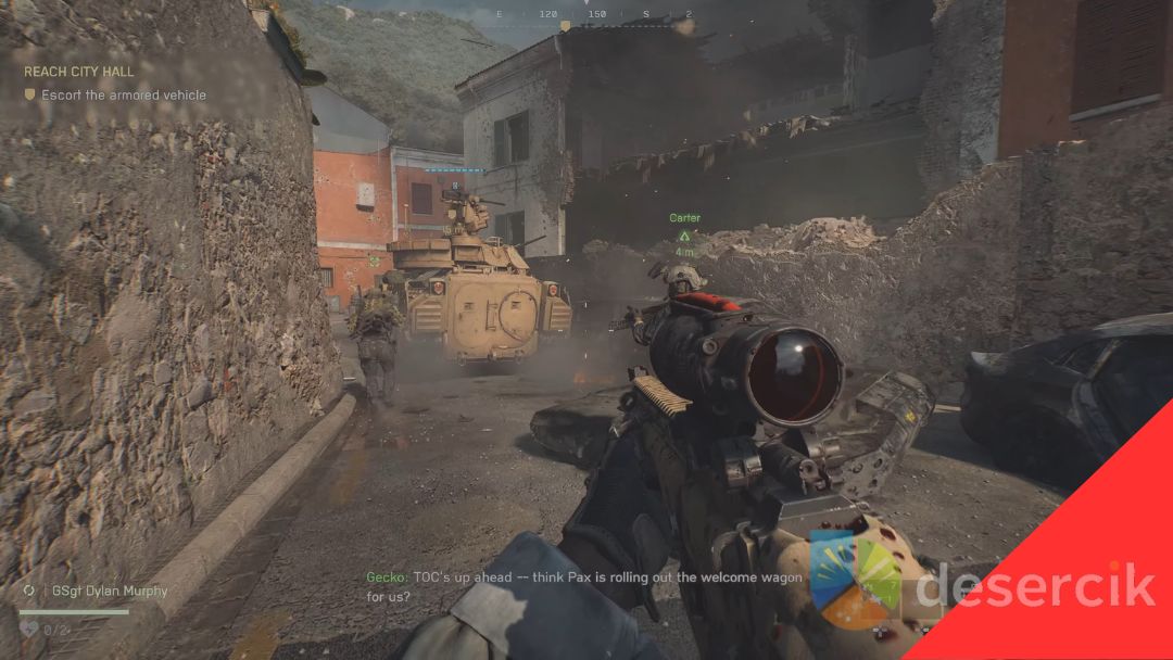 Kiedy pojazd ruszy w głąb miasta, z dachów zaczynają spadać pociski RPG. Twój AAV dostaje mocno w kość – użyj narzędzia naprawczego, żeby przywrócić go do pełnej sprawności. Potem konwój przemieszcza się w wąskie uliczki pełne oporu wroga.