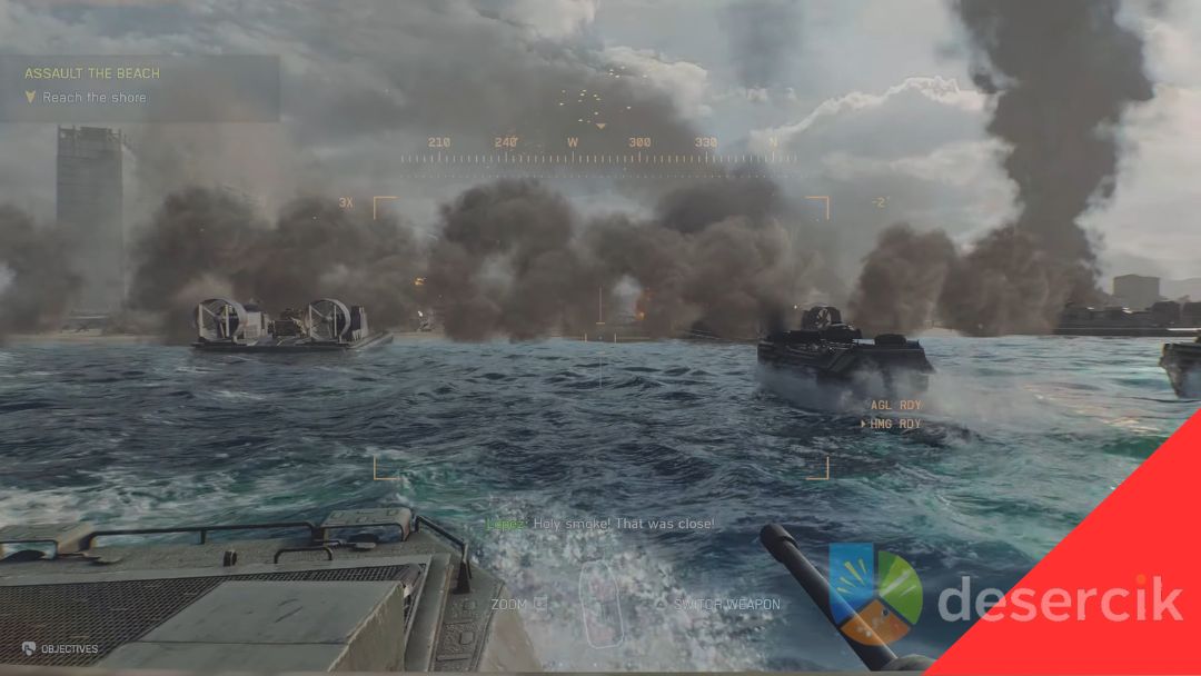 Gdy desant dociera bliżej brzegu, w oddali widać umocnienia wroga na klifach. Strzelaj do oznaczonych celów – na tym etapie wszystko, co się rusza, to przeciwnicy.