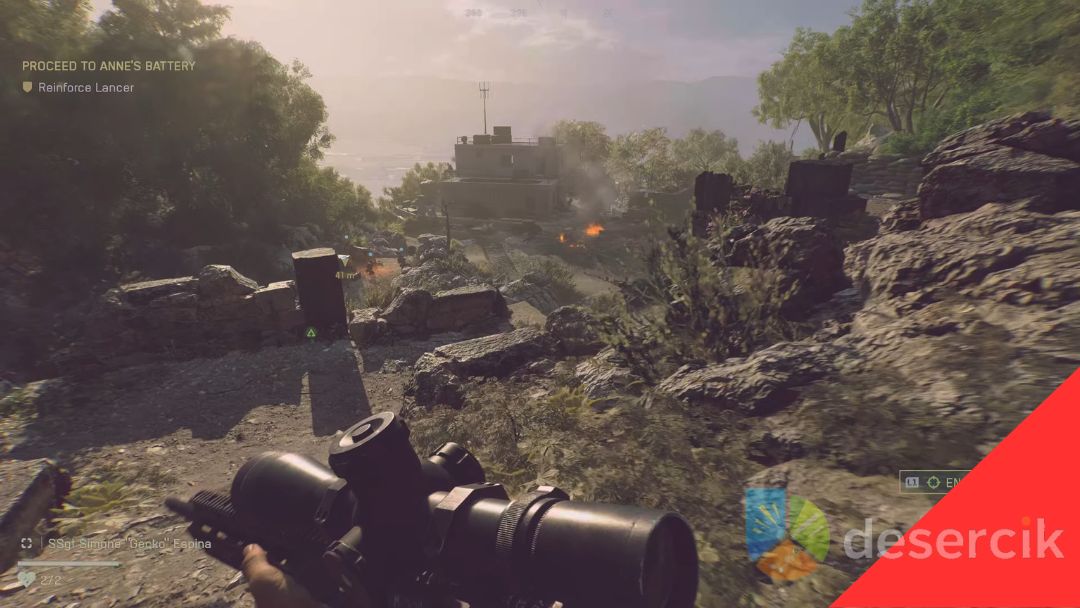 Następnie przenieś się do wieży obserwacyjnej. Wspinasz się po drabinach, a na dole trwa zasadzka na twoich sojuszników. Z góry masz świetny widok – zdejmuj snajperów, RPG-owców, kierowców ciężarówek z CKM-ami, a nawet śmigłowiec, który zrzuca posiłki. Wykorzystuj system oznaczania celów, by ułatwić drużynie eliminację wrogów.
