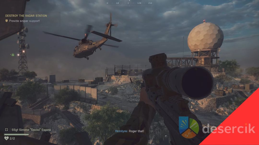 W pewnym momencie tunel się rozdziela. Twoja część drużyny skręca w lewo i wychodzi na powierzchnię. Na wzgórzu zajmujesz pozycję snajperską z widokiem na radar. Twoim zadaniem jest usunąć strażników – cierpliwie, po jednym, czekając aż wyjdą z ukrycia.