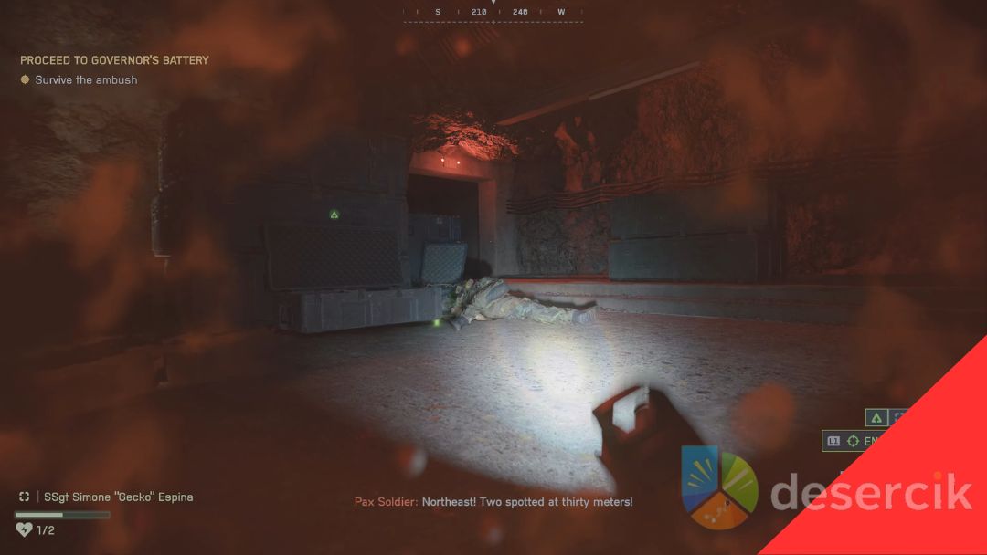 Po zabezpieczeniu okolicy ruszacie w górę ścieżką, by dotrzeć do stacji radarowej. Oddział decyduje się przejść tunelami pod ziemią, by zaskoczyć wroga od tyłu. Wewnątrz panuje cisza – można złapać oddech.