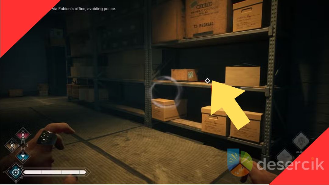 Gdy dotrzesz do biura Fabiena, okaże się, że potrzebujesz klucza, aby wejść do środka. Udaj się do pomieszczenia z dowodami, korzystając z ukryć i kucania, aby ominąć funkcjonariuszy. W rogu pokoju znajdziesz klucze do biura Fabiena, które pozwolą ci kontynuować misję. Umiejętności takie jak Blink mogą przyspieszyć przemieszczanie się i pomóc w unikaniu wykrycia, szczególnie w korytarzu na dole budynku.