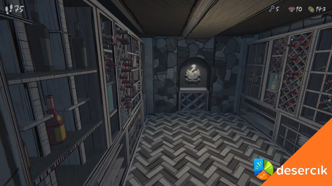 Właśnie tam trafiasz na trzy błyszczące klejnoty i herb zawieszony nad stołem, który pełni rolę cichej podpowiedzi. Łatwo go zignorować, ale jeśli połączysz fakty, poczujesz się jak ktoś, kto naprawdę odkrywa sekrety tej przedziwnej posiadłości.