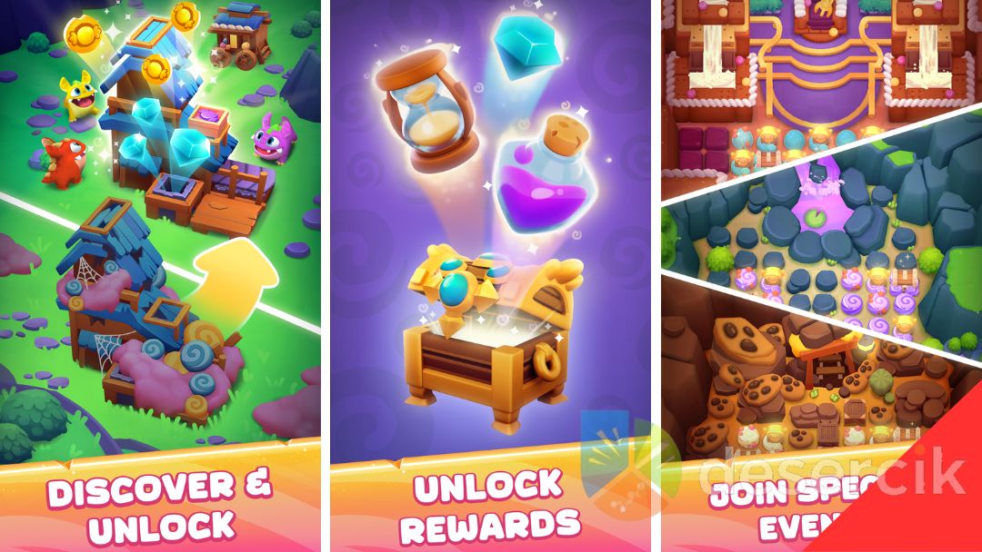 Możesz rekrutować Chomplets i ulepszać karty za złoto, a eliksiry również można wykorzystać do ulepszeń. Na końcu przeszkody cukierkowej upewnij się, że nie zostawiłeś żadnych cukierków – przesuń Chompleta do wszystkich pozostałych przeszkód, aby zebrać ukryte w nich skarby. Dzięki temu szybko zgromadzisz zasoby i będziesz mógł dalej zdobywać nagrody. Nie zostawiaj cukierków – oczyszczaj wszystko, aby odkryć wszystkie ukryte skarby.