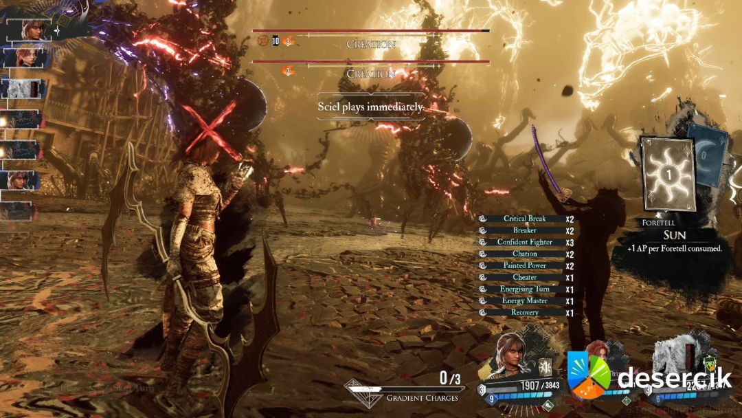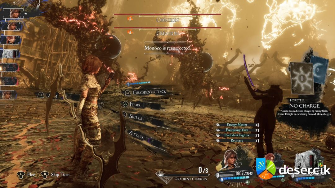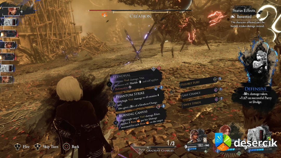 • Status Inwersji: Na początku walki Creation nakłada na całą drużynę status Inwersji, uniemożliwiający leczenie. Warto zaopatrzyć się w luminę, która zniweluje ten efekt, np. poprzez Pobudzające oczyszczenie dostępne u handlarza w Monolicie.