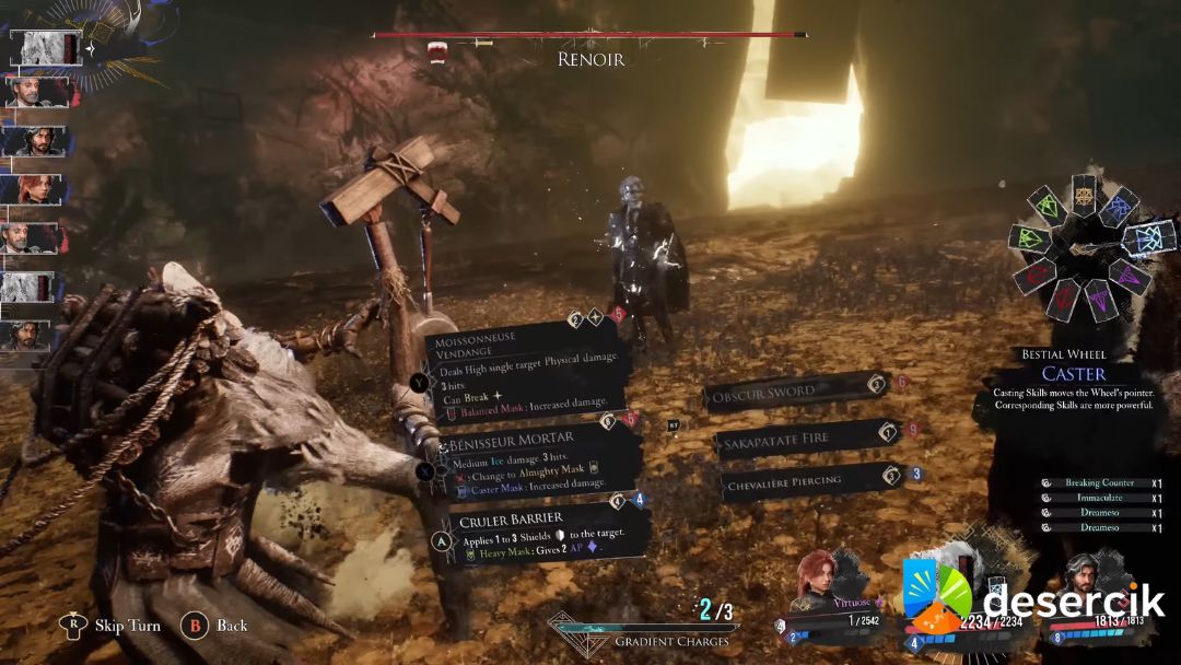 Zapomnijcie o planach, bo Renoir lubi zaskakiwać. Jego unikalne zdolności, jak nagłe eliminowanie postaci, potrafią kompletnie wywrócić walkę do góry nogami. Nie da się ich przywrócić – dlatego traktujcie je jako priorytet do neutralizacji. Na szczęście, jest to atak Chromatic, więc jeśli złapiecie timing, możecie wyprowadzić świetną kontrę – parowanie tuż przed jego skokiem i użycie Gradient Counter działa jak marzenie.