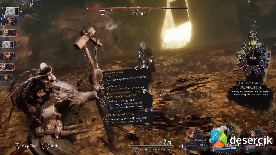 Poza tym, większość ataków Renoira po prostu mocno bije i wymaga cierpliwości. Najczęściej używa masowych fal Chroma, które potrafią wyczyścić całą drużynę.