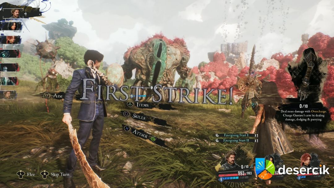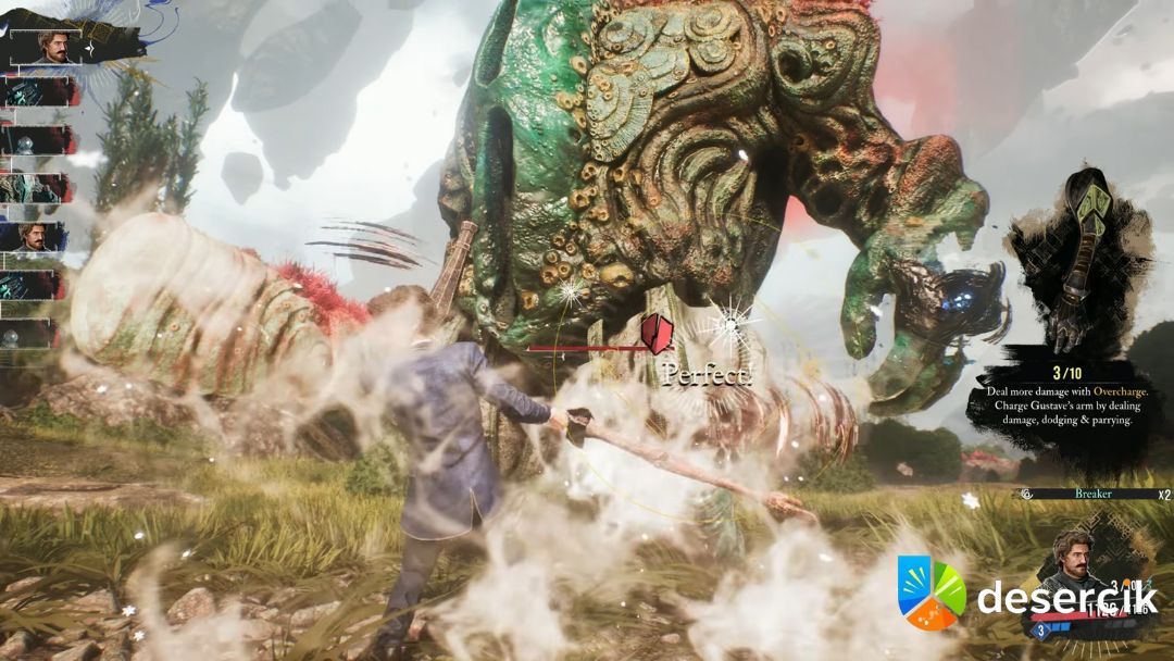 Na pierwszy rzut oka Gustave może wydawać się nieco ograniczony. Jego drzewko rozwoju jest węższe niż u pozostałych postaci, a broń – zaskakująco pozbawiona bonusów. Jednak to właśnie w tej prostocie tkwi siła. Kluczową mechaniką Gustave’a jest „Przeciążenie” (Overload) – unikalna zdolność, dzięki której jego ataki zyskują potężne bonusy do obrażeń w zamian za zgromadzone ładunki.